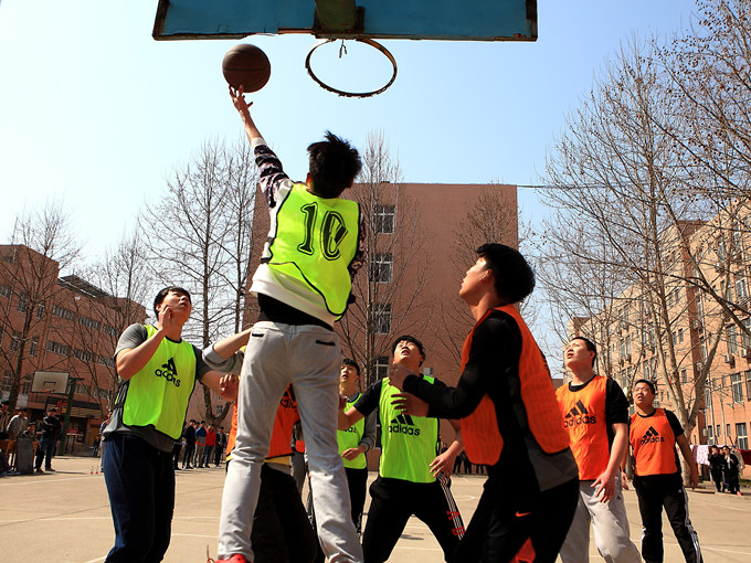 公寓文化节的第一项活动是“走进春天走进操场‘追梦杯’”男子篮球赛,下图为第一场比赛在新3号楼和新10号楼的两队之间进行。(郭玉洁)