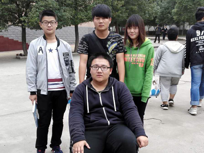 10月中旬以来,在从新苑区2号宿舍楼到主校区计算机实训中心的路上,每天都会出现这样一个画面:一个坐着轮椅的男同学,被一群同学们簇拥着一起去上课,而且由于他们的课程全部是在计算机实训中心5楼、6楼的美斯坦福专用教室和机房上课的,所以每当上楼梯的时候,由于这位坐轮椅的同学有点胖,同学们背不动,于是总是几位同学们抬着他上楼。事情是这样的: