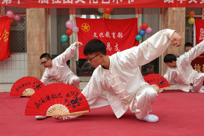 太极爱好者协会表演的内容精彩纷呈,集中太极拳套路、器械套路和特技表演三部分,其身法、拳法、腿法中的“刚”与柔美的身姿展现出刚柔并济的魅力,令人拍案叫绝,引起现场观众雷鸣般的掌声。将太极的精神与我国的传统道德思想联系在一起,使更多学生能切身体会到运动与艺术的魅力,对提高全院学生的思想素质和文化素质有着十分积极的促进作用。(邵 超)