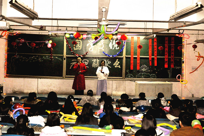 在身着汉服的主持人简单介绍后,联欢会便在一段精彩的“精武门”武术表演中正式进行,刚欣赏完精彩的武术表演,紧接着便是由《礼仪之邦》伴奏而进行的古典舞蹈,为我们展现了祖国五千年灿烂文化的一角。之后,由两位国学班同学带来的自编自演的相声将联欢会推向高潮,身着汉服的同学们给我们带来了一段精彩的手语操、《天仙配》、个人才艺表演等节目,为老师和同学们带来了一场文艺盛宴。