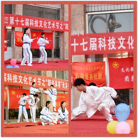 4月27日下午,由文教部主办,跆拳道协会、太极协会、健美操协会共同承办的“第十七届科技文化艺术节——“阳光体育”风采秀会演在学海英姿广场举行。来自跆拳道协会、太极协会、健美操协会等社团的同学们展示了他们日常训练成果和才艺,获得同学们赞扬。红蜻蜓艺术团,特舞团,武术协会带来了精彩助演。通过此次活动,弘扬了体育文化精神,同时也向全院师生展现我们体育类社团的魅力与当代大学生的青春与活力。(邵超)
