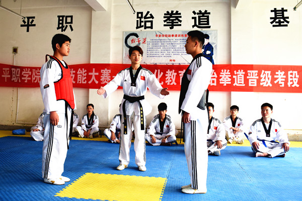 5月5日,平职学院技能大赛之跆拳道晋级考带活动在院士楼5楼跆拳道基地举行。