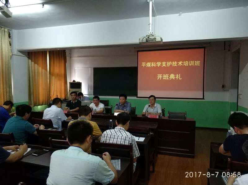 8月7日上午,2017年平煤集团科学支护技术第一期培训在我院工贸校区举行了开班典礼。平煤集团开拓处孙海良处长、王占新科长、郭亚伟科长等领导出席开班典礼并作重要讲话.会议由成教学院杜卫新院长主持。此次培训共计三期200余人,培训对象来自各原煤生产单位开掘矿长、总工程师、开掘副总、总办室主任、开拓科(区)长、总办室从事设计人员、部分优秀基层区队队长及技术主管。