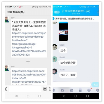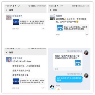 在思政大课开课前,经管学院的教师和辅导员纷纷在朋友圈、qq群等多个平台上转发了疫情防控思政大课的预告。