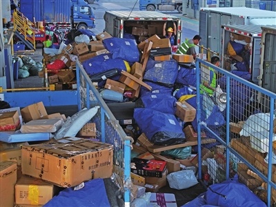 图为今年“双十一”期间工人在位于广西南宁市五象新区的一家快递转运中心装卸包裹(无人机照片)。记者 周华 摄