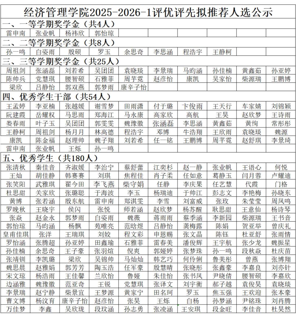 根据《平顶山工业职业技术学院学生表彰奖励办法》相关规定,经学生本人申报,院部测评领导小组依据《平顶山工业职业技术学院学生综合素质测评办法》各项目综合素质测评成绩审查,拟推荐以下同学获得学年、一、二、三等学期奖学金、优秀学生干部、优秀学生。本着公平、公正、公开的原则,现将名单予以公示。