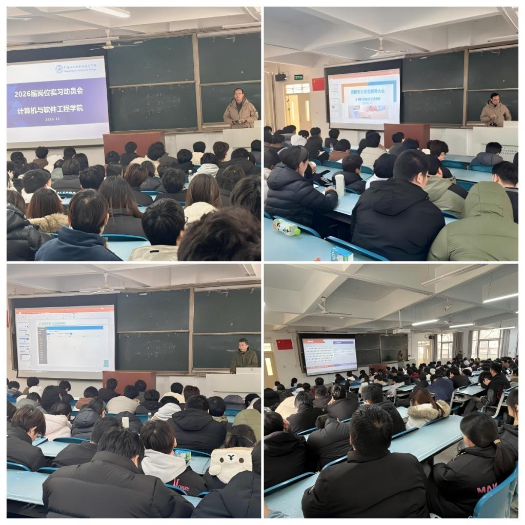 为扎实推进2026届二年制及“3+2”各专业岗位实习工作,引导学生明确实习意义、规范实习行为、强化安全意识,12月16日中午,计算机与软件工程学院在2号教学楼101教室组织召开实习动员大会。各专业负责人、实习指导教师、辅导员及全体实习学生参加此次大会。