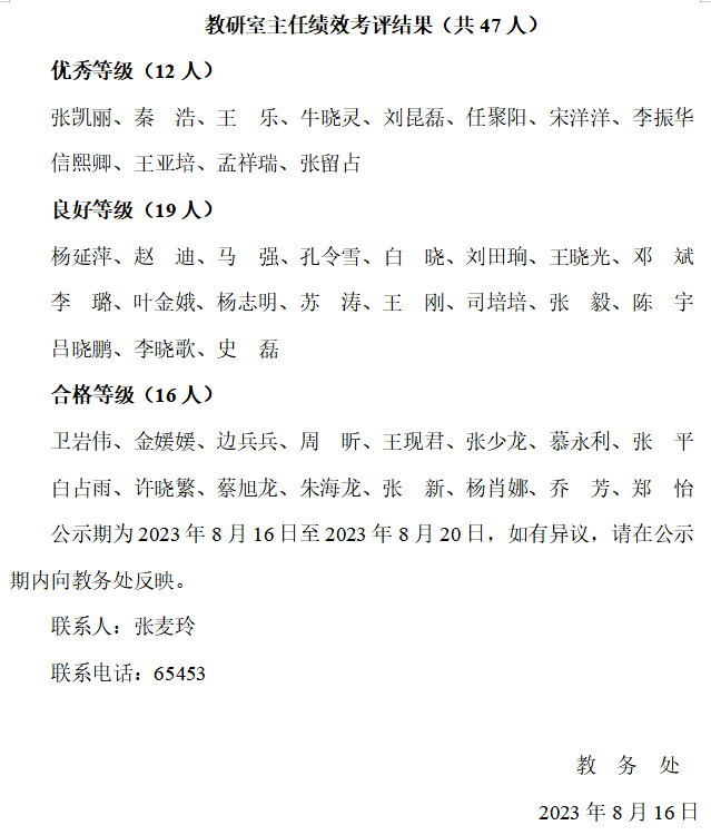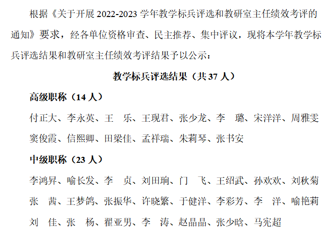 关于2022-2023学年教学标兵评选和教研室主任绩效考评结果的公示