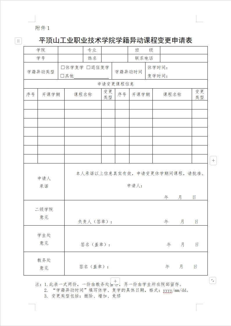 附件1:平顶山工业职业技术学院学籍异动课程变更申请表