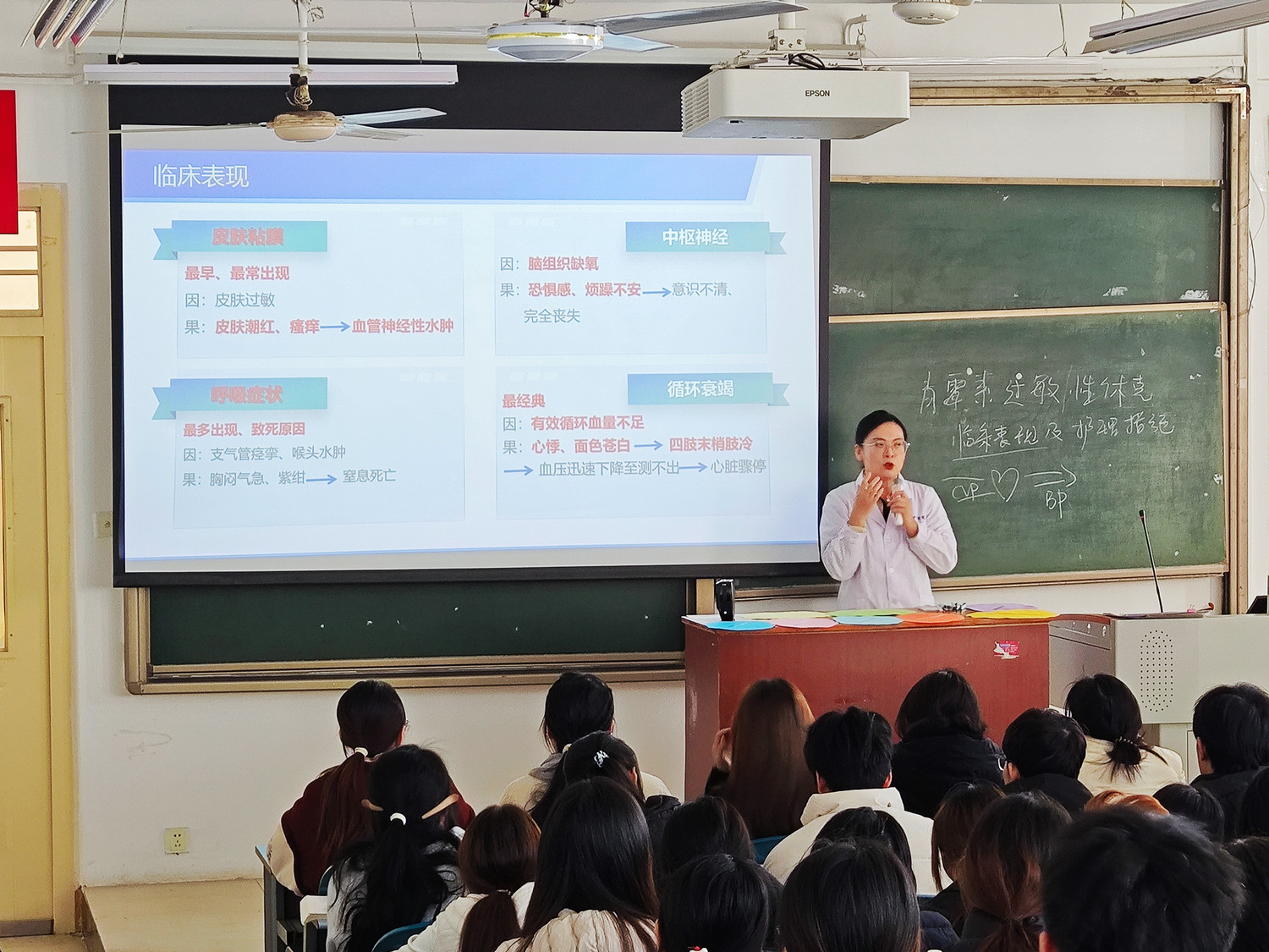 护理学院李赛蕊老师主讲了《护理学基础-皮试液配置和青霉素过敏性休克的抢救》课程。她借助AI工具制作青霉素过敏致死案例视频,以震撼视觉引出知识点,让抽象知识鲜活且具警示性;创新“砸彩蛋”互动环节,融趣味于教学,激发学生参与热情,深化知识理解记忆。课程采用演示、讲授、提问等多元方法,围绕皮试液配置和过敏休克抢救展开,明确三维教学目标,聚焦重点、攻克难点,助力学生掌握核心技能,树立职业意识,尽显其扎实教学功底与对护理人才培养的深度把控。