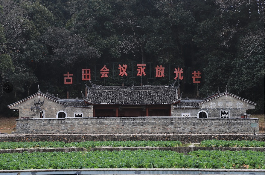 古田会议会址背靠参天古木林,在茂密树林的掩映下“古田会议永放光芒”八个红色大字,数里之外便赫然跃入眼帘,熠熠生辉。
