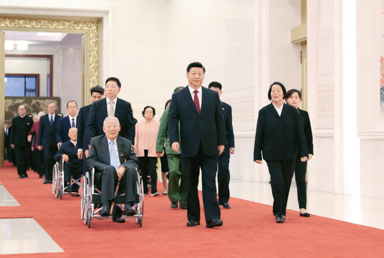 (2019年9月29日,中华人民共和国国家勋章和国家荣誉称号颁授仪式在北京人民大会堂金色大厅隆重举行。中共中央总书记、国家主席、中央军委主席习近平同国家勋章和国家荣誉称号获得者一同步入会场。 新华社记者 丁海涛/摄)