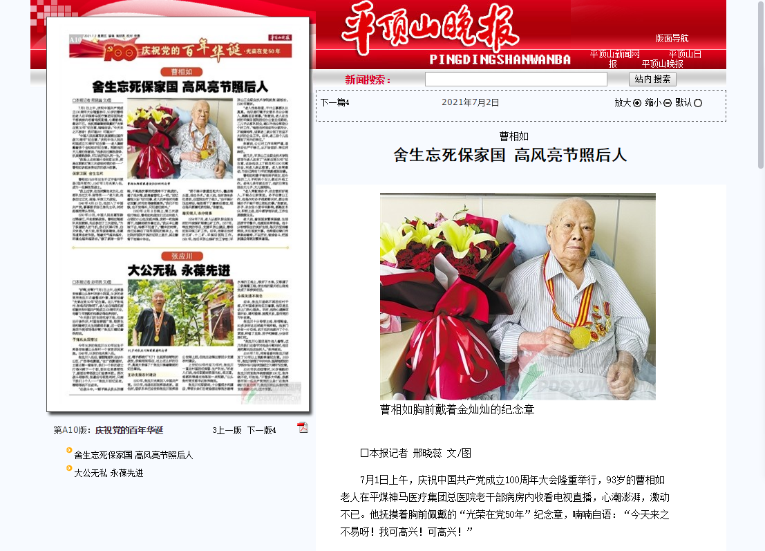 7月1日上午,庆祝中国共产党成立100周年大会隆重举行,93岁的曹相如老人在平煤神马医疗集团总医院老干部病房内收看电视直播,心潮澎湃,激动不已。他抚摸着胸前佩戴的“光荣在党50年”纪念章,喃喃自语:“今天来之不易呀!我可高兴!可高兴!”