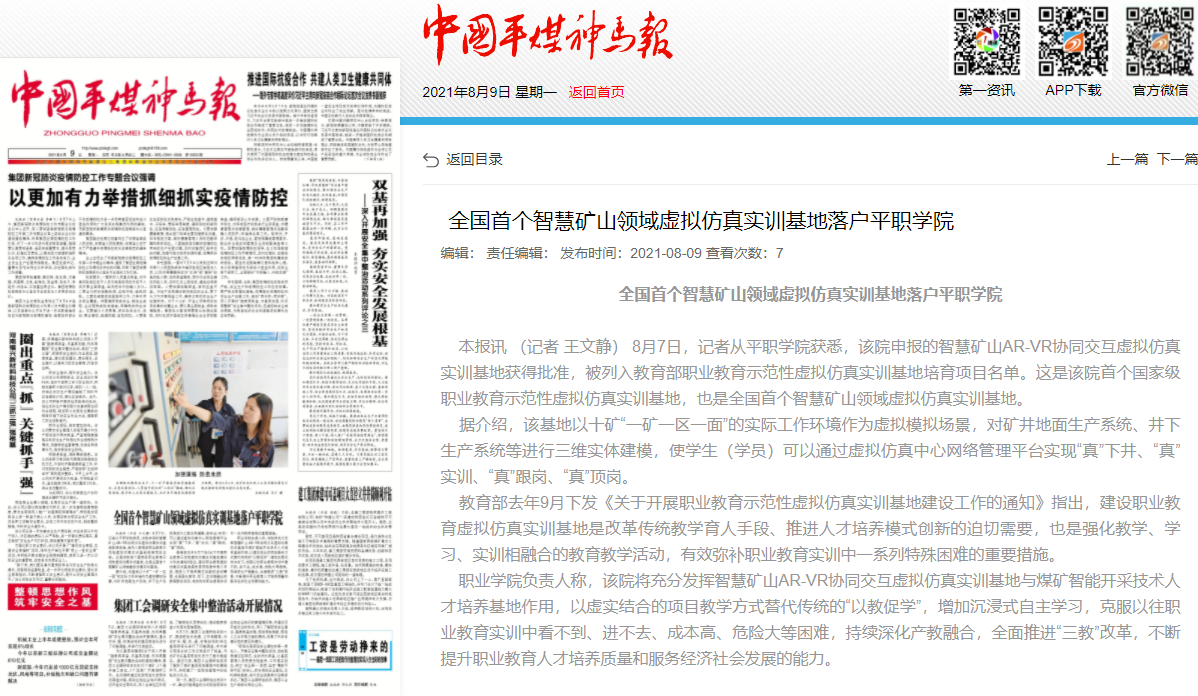 本报讯 (记者 王文静) 8月7日,记者从平职学院获悉,该院申报的智慧矿山AR-VR协同交互虚拟仿真实训基地获得批准,被列入教育部职业教育示范性虚拟仿真实训基地培育项目名单。这是该院首个国家级职业教育示范性虚拟仿真实训基地,也是全国首个智慧矿山领域虚拟仿真实训基地。