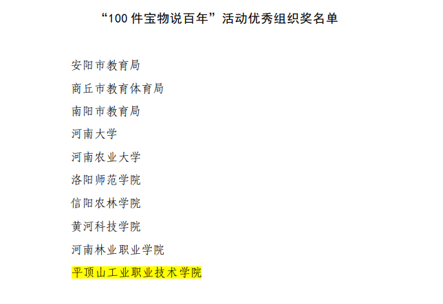 近日,中共河南省委高校工委、河南省教育厅、河南广播电视台公布了《关于公布庆祝建党100周年“100年党史100问”“100件宝物说百年”“100校红色大闯关”获奖名单的通知》(豫高发〔2021]102号),我校获得二等奖1项,三等奖2项,并获得“100件宝物说百年”活动优秀组织奖”。