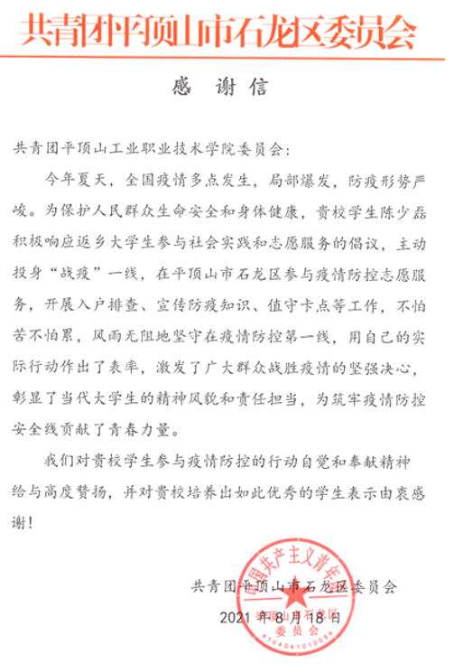 近日,学校收到来自共青团平顶山市石龙区委员会发来的感谢信。在感谢信中,表达了对我校以及学校培养的优秀大学生陈少磊的赞扬和感谢。