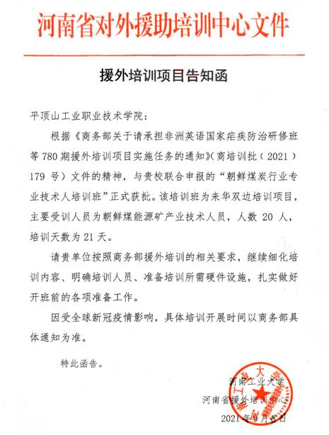 近日,我校与河南省对外援助培训中心联合申报的“朝鲜煤炭行业专业技术人员培训班”获商务部批准。