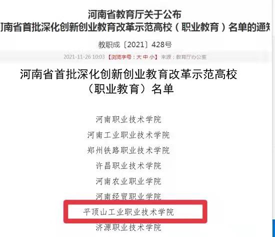 近日,河南省教育厅下发了《关于公布河南省首批深化创新创业教育改革示范高校(职业教育)名单的通知》,认定13所高校为河南省首批深化创新创业教育改革示范高校,我校成功入选。