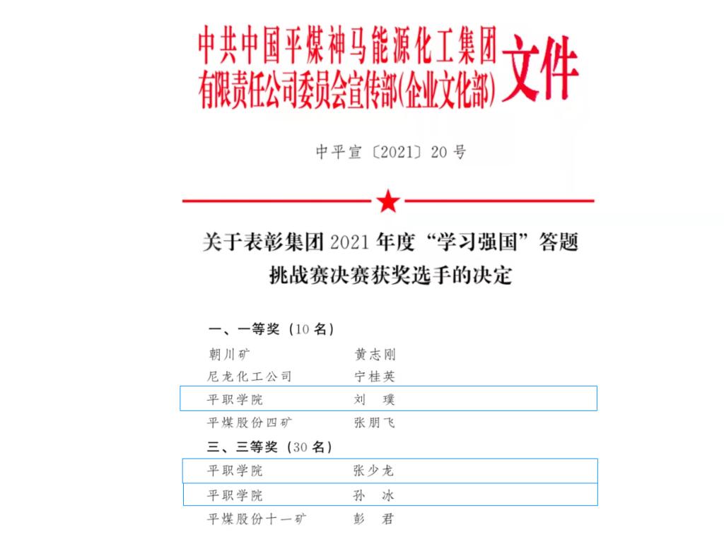 近日,在集团2021年度“学习强国”答题挑战赛决赛中,我校教师刘璞、张少龙、孙冰喜获佳绩。