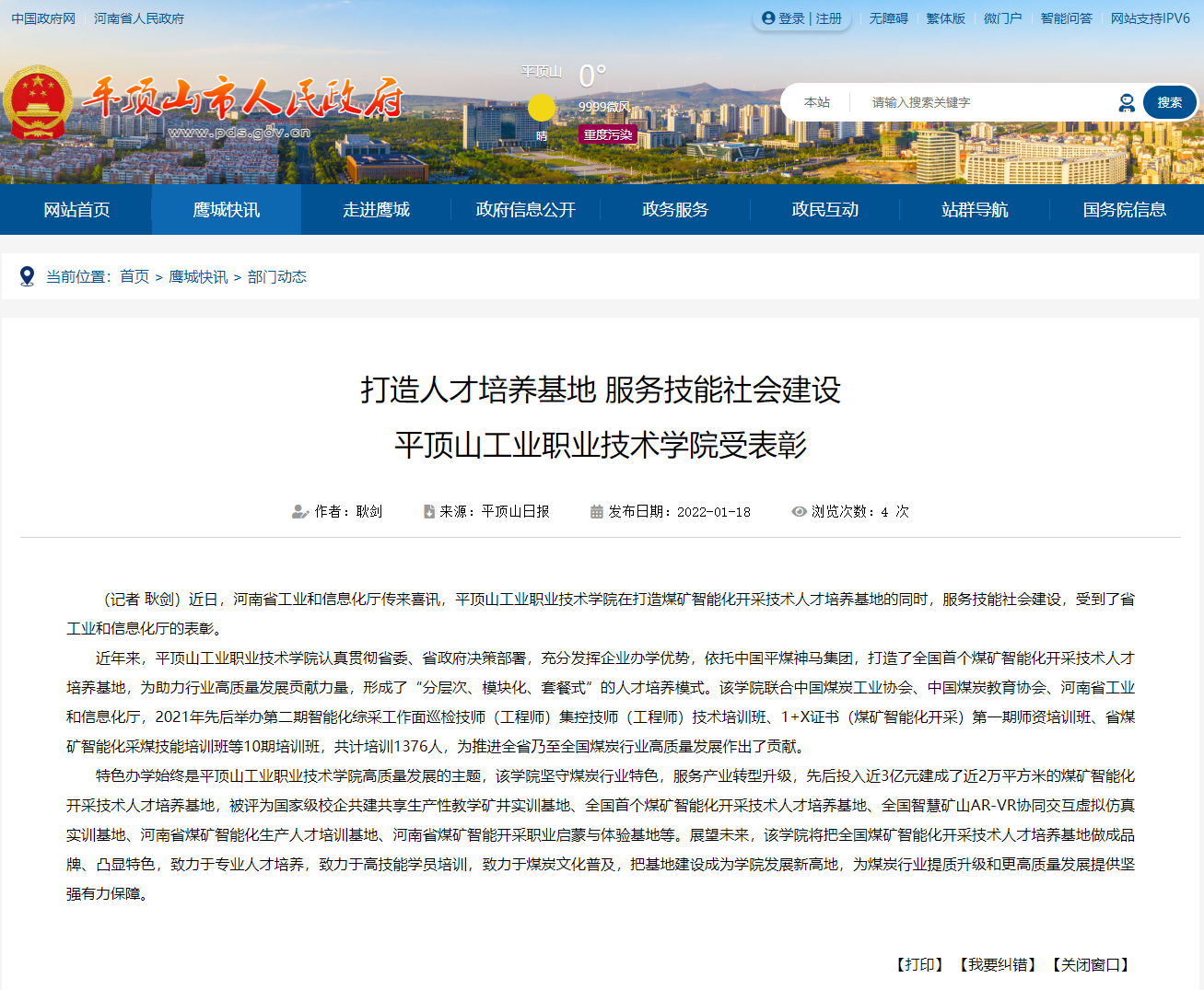 (记者耿剑)近日,河南省工业和信息化厅传来喜讯,平顶山工业职业技术学院在打造煤矿智能化开采技术人才培养基地的同时,服务技能社会建设,受到了省工业和信息化厅的表彰。