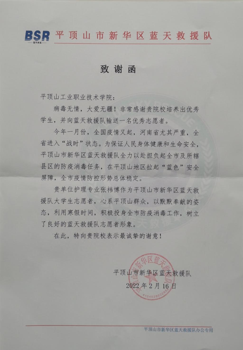 2月16日,学校收到一份来自平顶山市新华区蓝天救援队的致谢函,信中对我校20级护理专业5班学生张祎博在禹州学子隔离期间敢于付出、勇于担当的精神表达了感谢和赞赏。
