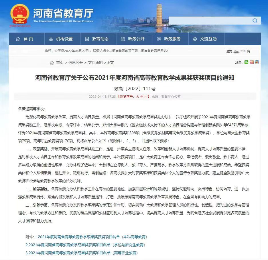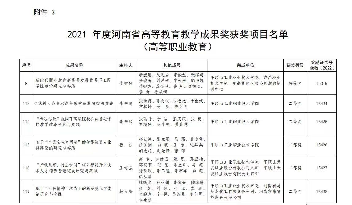 近日,河南省教育厅公布了2021年度河南省高等教育教学成果奖获奖项目名单,我校共有6项成果喜获2021年度教育教学成果奖。其中,校长李树伟教授主持的《新时代职业教育高质量发展背景下工匠学院建设研究与实践》荣获特等奖。