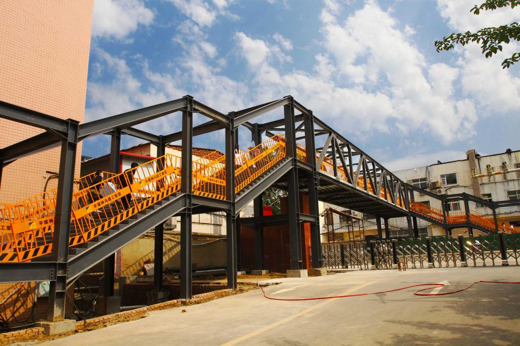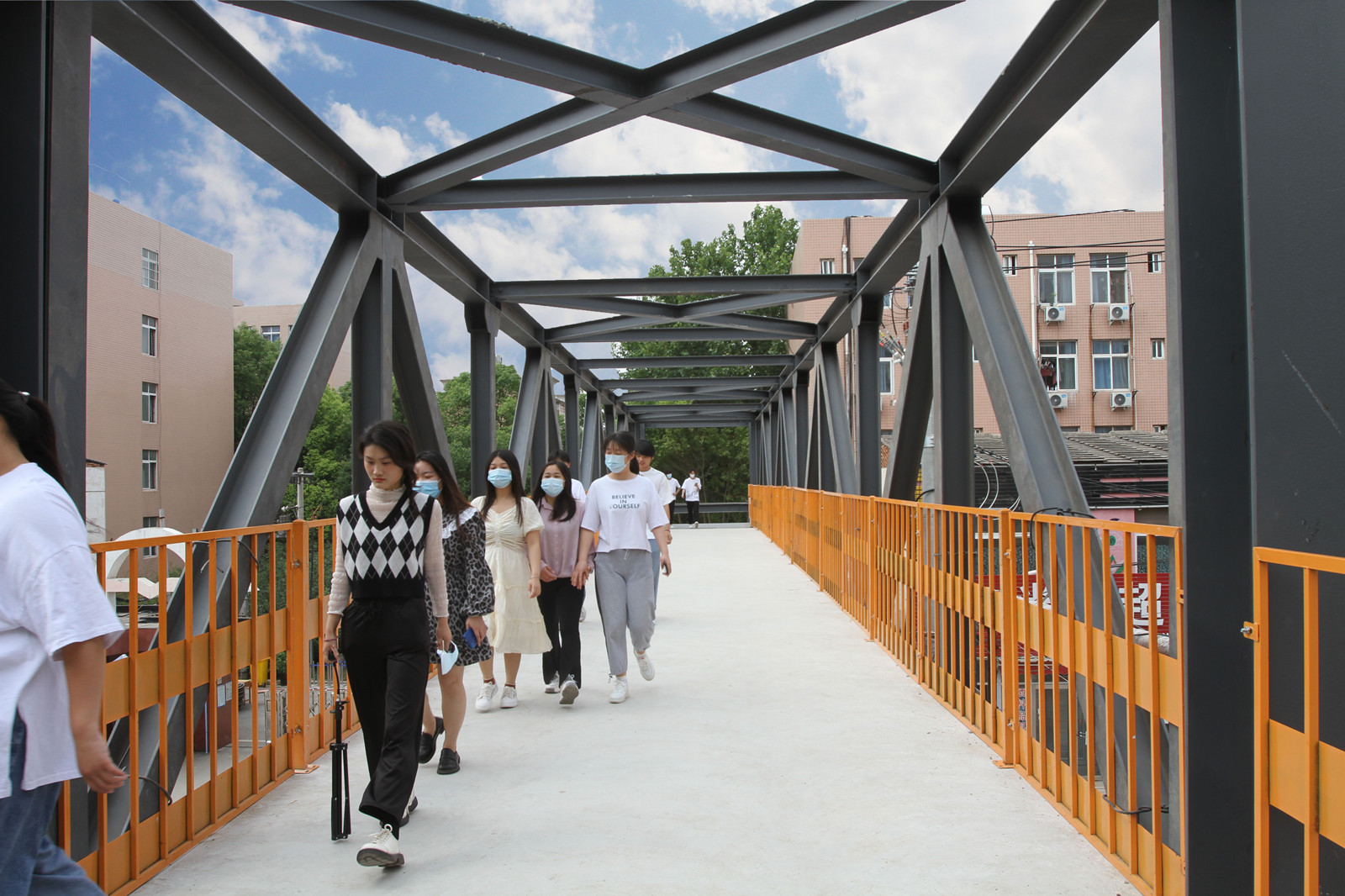 我校过街天桥位于南生活苑区大门与主校区南门东侧之间,上跨水库路,跨度为60米,桥面宽度3.6米,桥梁上部采用成熟的钢架结构,天桥的建设将有效解决学校南北院区广大师生的出行安全与便利问题。