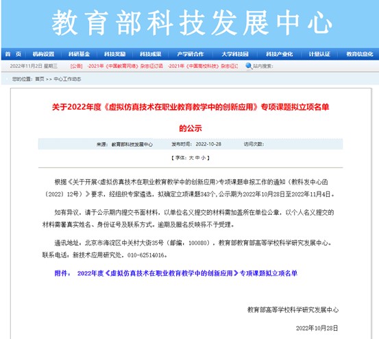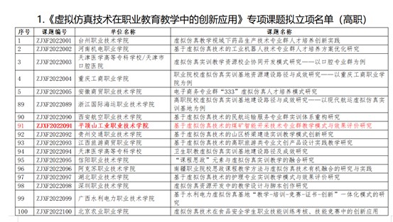 近日,教育部发布《关于2022年度<虚拟仿真技术在职业教育教学中的创新应用>专项课题拟立项名单的公示》,我校申报的《基于虚拟仿真技术的煤矿智能开采技术专业群教学模式与效果评价研究》获批立项。