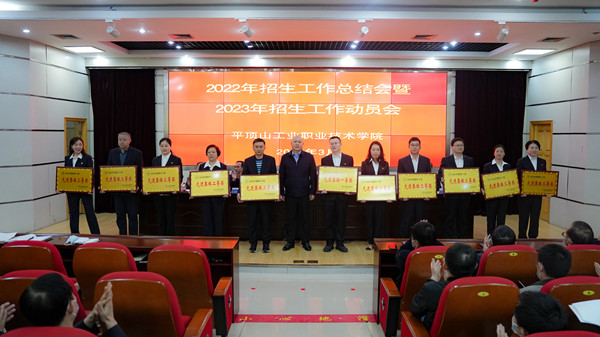 校党委书记毕晓阳讲话。他首先代表学校党政向受到表彰的先进集体和先进个人表示热烈的祝贺。他强调,一要珍惜当前成绩,坚定发展信心。准确把握职业教育发展带来的新挑战和新机遇,进一步增强竞争意识和忧患意识,抓住关键环节,发挥学校优势,结合自身工作实际,围绕师资队伍、教育教学质量、学生管理水平、后勤服务能力等重点领域,持续强化内涵质量建设,提升学校核心竞争力,为推动学校高质量特色发展作出新的更加积极的贡献。二要正视存在不足,努力改进提升。大力弘扬不畏艰难、不辞劳苦、积极进取的优良作风,以好风气凝聚正能量、以好风气推动新发展,学习借鉴先进典型的经验做法,不断提高、不断进步,齐心协力推动学校招生工作再创佳绩。三要加强团结协作,汇聚强大合力。大力弘扬“全校一盘棋”思想,牢固树立主人翁意识,甘于奉献,敢于吃苦,视招生工作为已任,谋工作一条心,干工作一盘棋,抓落实一股劲。要紧紧围绕招生工作,搞好衔接配合,在开展工作中既要有干事的本领和精神,更要有共事的意识和水平,部门之间搞好配合,形成联动工作机制。四要强化责任担当,再创工作佳绩。全体教职工要强化责任担当,积极服从安排和调遣,协调好各方工作,主动参与招生,要时刻保持求真务实的工作作风、吃苦耐劳的奉献精神,要有耐心、有恒心,更要细心,充分展示我们平职教师的良好形象,要自觉地站在学校发展大局上想问题、看问题,确保学校的各项决策部署落实到位。