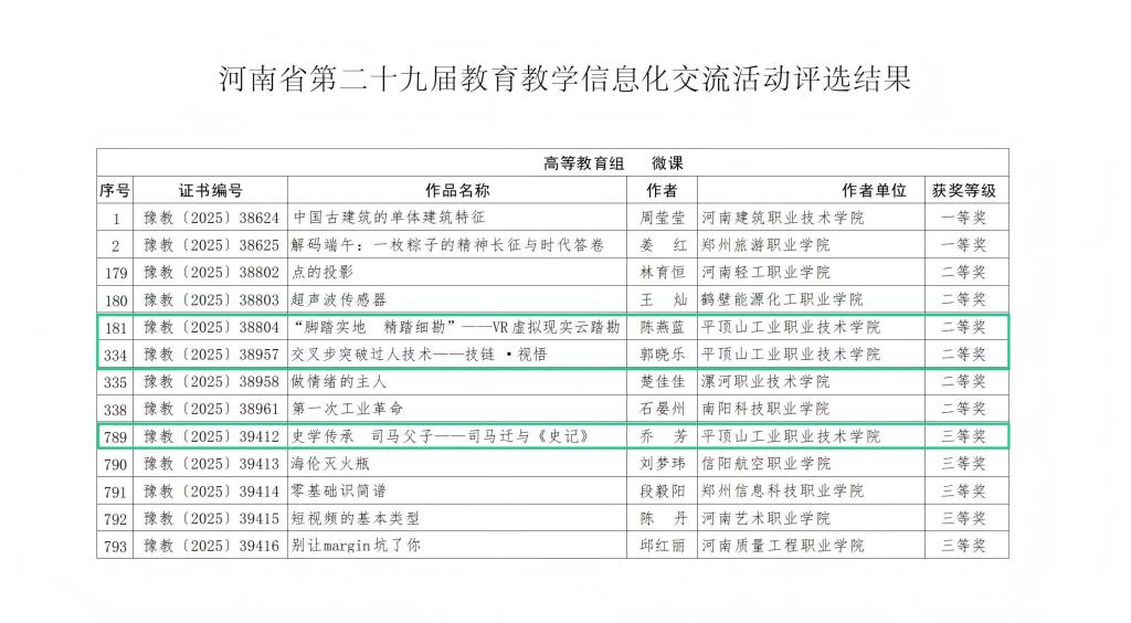 近日,河南省教育厅下发了《河南省教育厅关于公布河南省第二十九届教育教学信息化交流活动评选结果的通知》(教资保〔2025〕218号),我校3件作品获奖,其中二等奖2项,三等奖1项。
