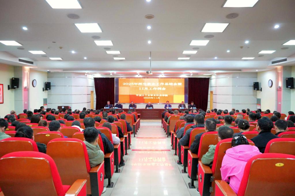11月28日下午,学校在图书馆报告厅召开2025年招生就业工作总结会暨11月工作例会,校党委书记毕晓阳出席并提出要求,校长李树伟出席并总结部署工作,校领导张立方、刘怀珍、杜卫新、杨立峰出席,副科级以上干部、招生就业受表彰人员、各县区招生负责人、教学单位教研室主任参加。校党委常务副书记、工会主席刘翱翔主持。