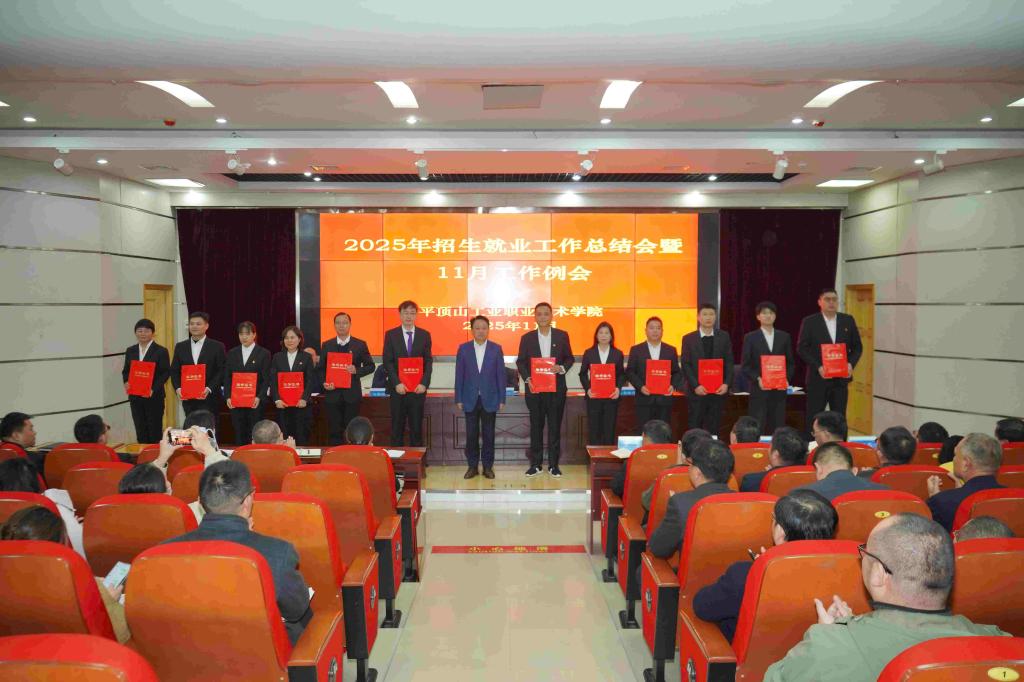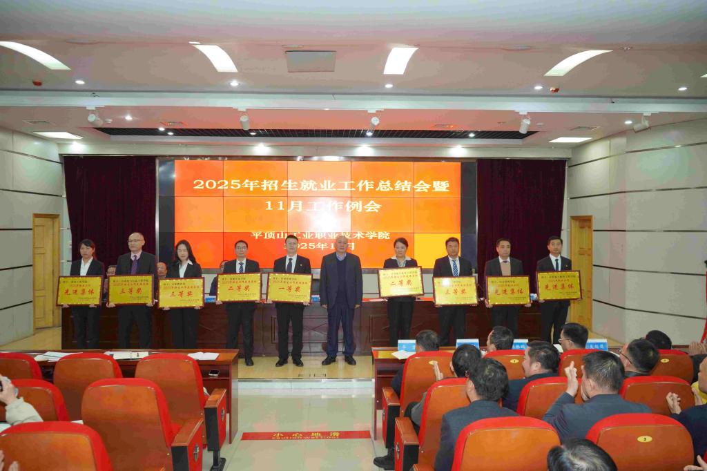 李树伟代表学校,向受到表彰的先进集体和个人表示热烈祝贺,向一年来为学校招生就业工作辛勤付出的教职工致以崇高的敬意和衷心的感谢,并对11月份工作进行系统回顾。他指出,11月份,各单位各部门辛勤工作,努力付出,各项工作有序开展,一是学校高质量通过全省高校思政课“大听课、大调研”调研组到校调研,展现了扎实的思政教学水平;二是教学工作成果丰硕,多项教材、教改项目、学生竞赛取得省级及以上佳绩;三是学生活动丰富多彩,管理与服务持续优化;四是成教培训校企合作深化,培训收入可观;五是技师学院工作稳步推进。着眼于12月份及全年工作的圆满收官,他强调,一是认真梳理抓好年度收尾工作,要对全年工作进行系统盘点,加快工作进度,确保各项目标任务圆满完成;二是统筹兼顾抓好明年工作谋划,要立足实际,对标对表,科学制定2026年工作计划;三是凝心聚力促进青年教师成长,要通过“老带新”、项目参与、教学竞赛等方式助力青年教师提升能力;四是认真做好职称评审工作,要严格程序,确保公开公平公正;五是积极推进元旦晚会筹备工作,要精心组织,展现学校育人成果;六是着力推动成教培训工作提质增效,要打造培训特色品牌,开拓市场空间;七是凝聚合力助推技师学院稳步发展,要深化教育教学改革,提升办学水平;八是精心筹备河南省职业院校技能大赛,要高标准做好赛事筹备和备赛工作;九是持之以恒抓好校园安全稳定,要加强安全管理,确保校园和谐稳定。为确保工作实效,他要求全体干部聚焦效率提升、工作深度和方法创新,做到精准发力、持续攻坚、谋求突破。