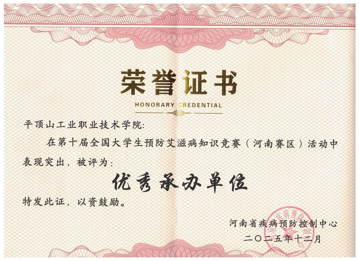 近日,在第十届全国大学生预防艾滋病知识竞赛(河南赛区)活动中,我校被河南省疾病预防控制中心授予“优秀承办单位”称号,参赛成绩位居全省高校前十。