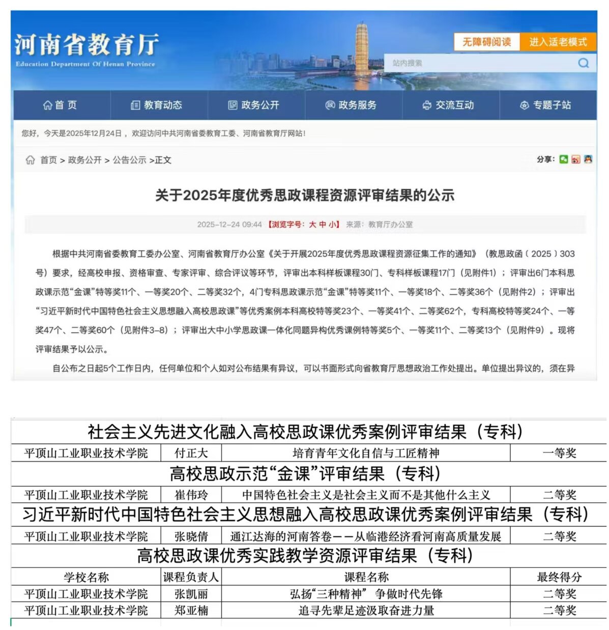 近日,河南省教育厅公示了2025年度优秀思政课程资源评审结果。我校马克思主义学院在多个评审类别中表现突出,斩获多项荣誉,充分展现了学校在思想政治理论课改革创新与内涵建设方面取得的扎实成效。