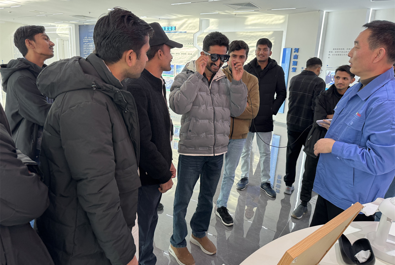 在产品展示区,工作人员结合新能源汽车、光伏储能、消费电子等领域的实例,向留学生们介绍了各类碳化硅粉体样品及下游应用产品。留学生们纷纷体验了以碳化硅为材料的VR眼镜,不时向企业工作人员提问相关问题。