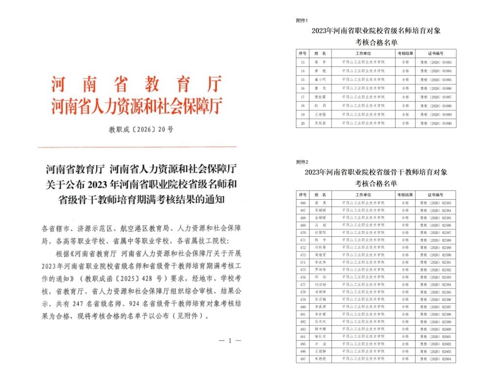近日,河南省教育厅、河南省人力资源和社会保障厅联合印发《关于公布2023年河南省职业院校省级名师和省级骨干教师培育期满考核结果的通知》(教职成〔2026〕20号),学校30名教师顺利通过培育期满考核。其中,高争、黄靓等8名教师被认定为省级名师,任聚阳、陈宇等22名教师被认定为省级骨干教师,充分彰显了学校师资队伍建设的扎实成效,为学校职业教育高质量发展注入强劲动力。