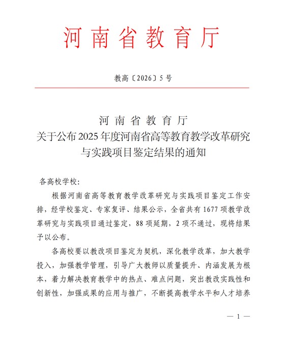 近日,河南省教育厅发布《关于公布2025年度河南省高等教育教学改革研究与实践项目鉴定结果的通知》(教高〔2026〕5号),由我校主持的8项高等教育教学改革研究与实践项目均顺利通过结项鉴定,充分体现了学校在深化教育教学改革、提升人才培养质量方面取得的显著成效。