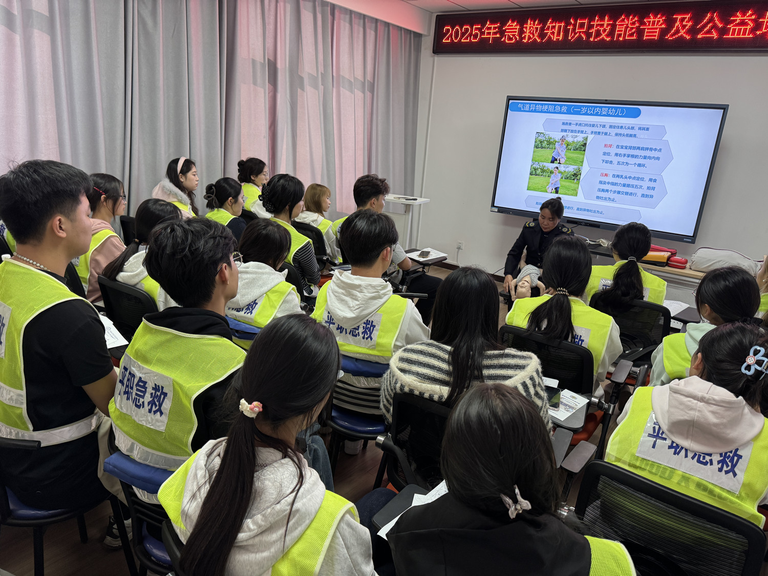 培训内容包括心肺复苏、自动体外除颤仪使用、气道异物梗阻解救术、创伤救护等关键急救技能。在专业导师带领下,学员们通过理论学习和实操演练,逐步掌握各项技术的操作要点。培训过程中,学生认真投入,反复练习,确保动作规范、技能到位。