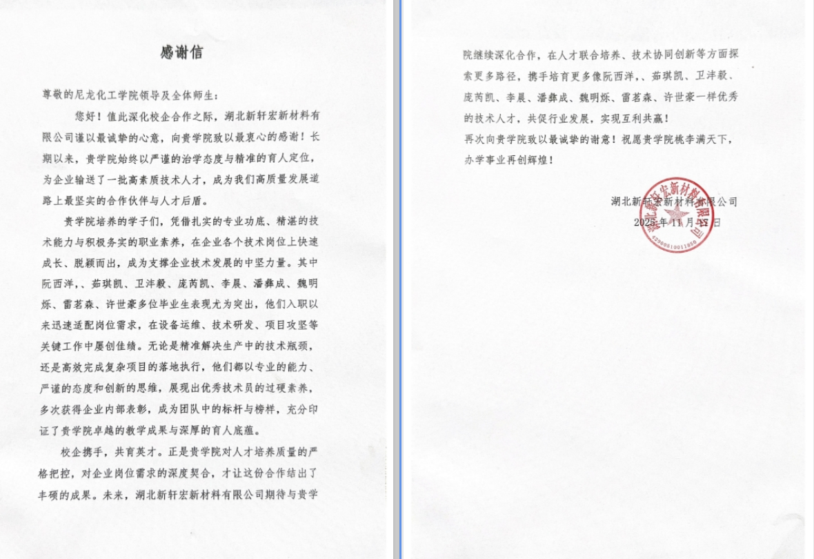 近日,尼龙化工学院收到合作企业湖北新轩宏新材料有限公司发来的感谢信。信中对学院培养的毕业生给予高度评价,称赞学子们具备扎实的专业功底、精湛的技术能力和积极务实的职业素养,同时对学院长期以来为企业输送高素质技术人才的支持表示衷心感谢。
