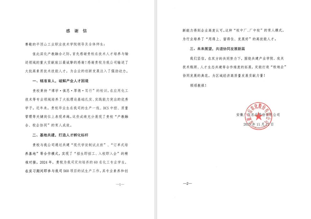 尼龙化工学院将以此次感谢信为契机,进一步深化与安徽广信农化有限公司的合作,持续优化人才培养方案,做好实习学生后续管理与服务工作。下一步,双方将围绕共建产业学院、攻关技术瓶颈、共建人才生态等维度拓展合作广度与深度,不断探索人才培养新模式、新路径,为行业发展和区域经济高质量发展输送更多高素质技术技能人才。