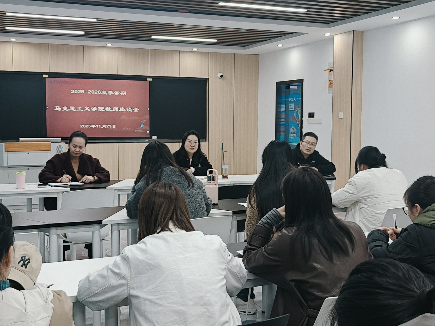11月21日下午,马克思主义学院在人工智能产业学院203教室组织召开本学期教师座谈会。学院领导主持会议,教务处相关负责人,学院思政主干课程教师参会,围绕思政课教学改革、质量提升等核心议题深入交流研讨,凝聚育人共识,为推动学院思政教育高质量发展集智聚力。