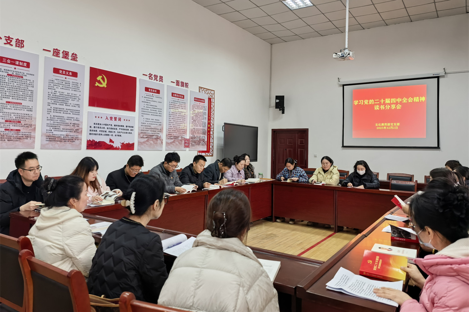 为深入学习贯彻党的二十届四中全会精神,切实把思想和行动统一到全会部署上来,12月2日下午,文化教育部党支部在党员活动室开展学习党的二十届四中全会精神读书分享会。