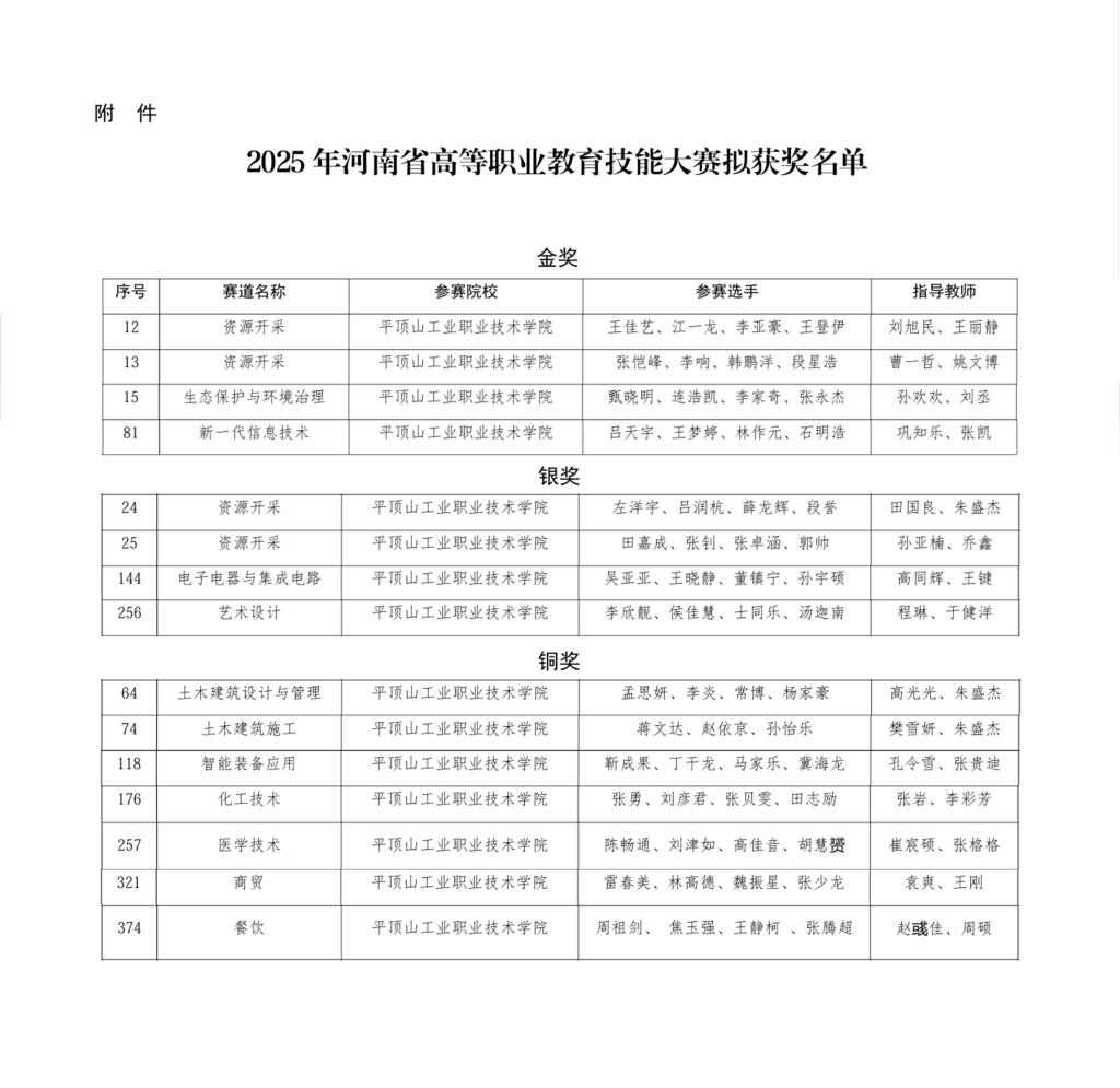 近日,河南省教育厅发布《关于 2025 年河南省高等职业教育技能大赛拟获奖名单的公示》,我校参赛团队一举斩获 4 金、4 银、7 铜的亮眼战绩。其中,金奖数量不仅创下近年新高,更有 4 条赛道成功锁定国赛名额,直观展现了学校在高素质技术技能人才培养工作中的扎实功底与卓越成效。
