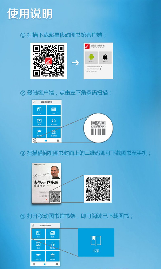 电子书借阅机预装了 3000 种独家授权的正版图书,内容涵盖精品推荐、经典名著、生活保健、经管理财、成功励志、小说传记、政史军事、文学艺术、科学技术、社会法律、哲学宗教、亲子育儿等,图书与出版社纸书同步发行,每月更新 150 种电子图书。电子书借阅机通过多点触控进行操作,支持滑动、拖动等手势。读者只要用手指轻轻地触碰显示屏上的图片就能实现对主机的操作,读者扫描二维码下载并安装超星移动图书馆客户端后,只需在电子书借阅机屏幕上选择心仪图书 , 扫描图书封面二维码,便可将该书下载至手机,免费体验高清电子阅读。(温馨提示:此应用大小约 20M ,为节省手机流量,读者可自行在应用市场搜索“超星移动图书馆” APP ,使用 WIFI 进行下载)。
