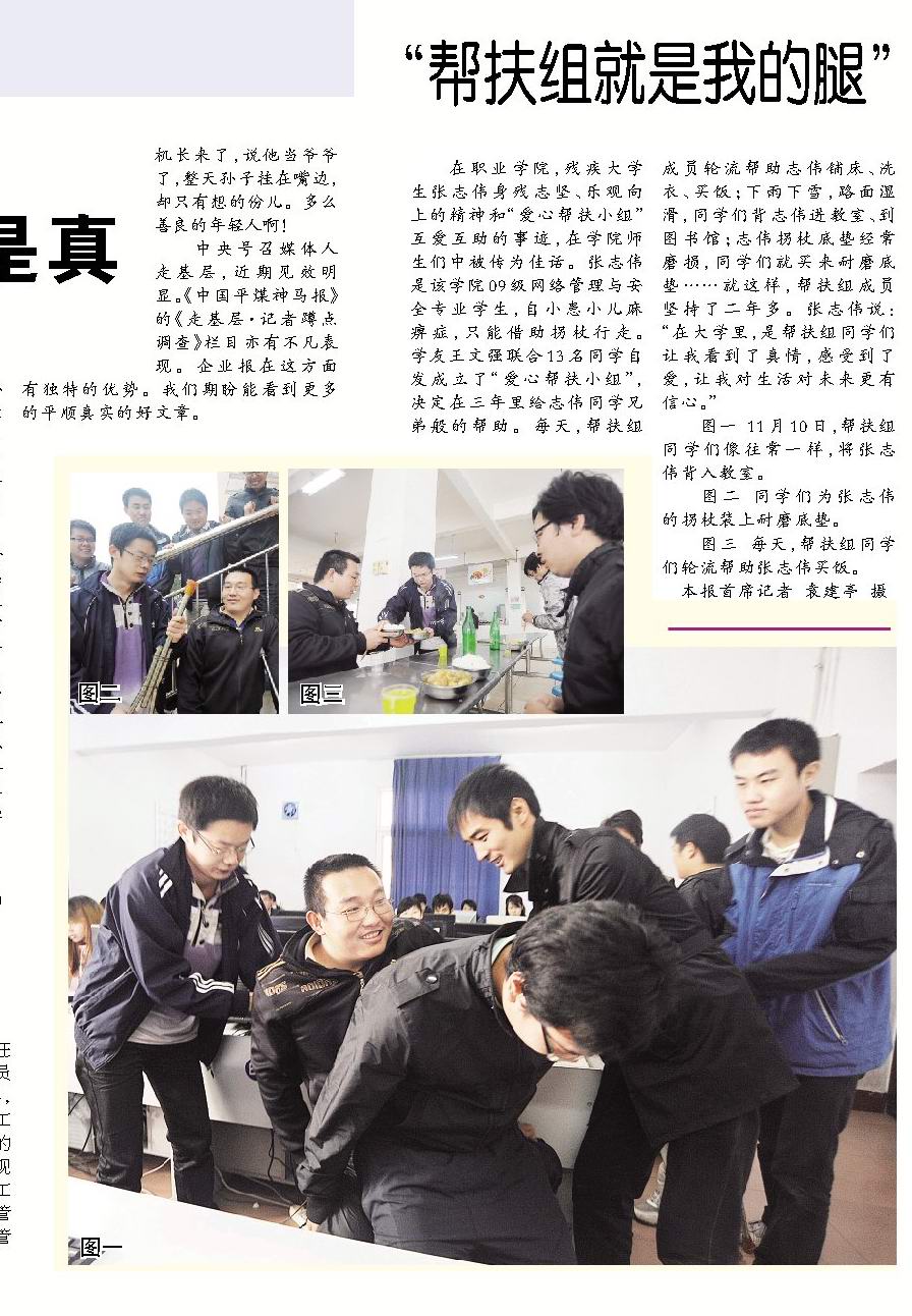 在职业学院,残疾大学生张志伟身残志坚、乐观向上的精神和“爱心帮扶小组”互爱互助的事迹,在学院师生中传为佳话。张志伟是该院2009级网络管理与安全专业学生,自小患小儿麻痹症,只能借助拐杖行走。学友王文强联合13名同学自发成立了“爱心帮扶小组”,决定在三年里给志伟同学兄弟般帮助。