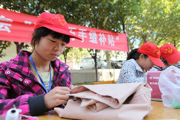 16名志愿者参加了此项活动,为学生缝补衣服60多件。此次活动让志愿者精神得到传递,让校园更加和谐温馨,同时也让同学们更进一步了解 “奉献、友爱、互助、进步”的志愿者精神。