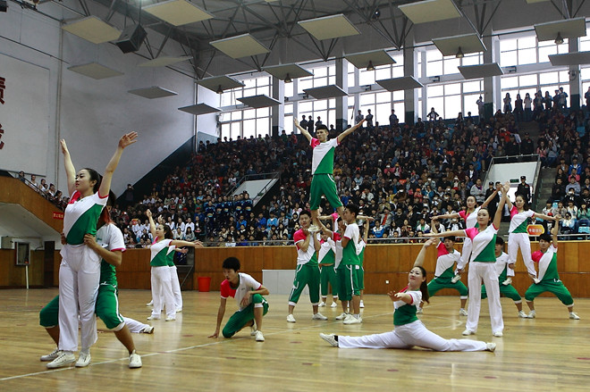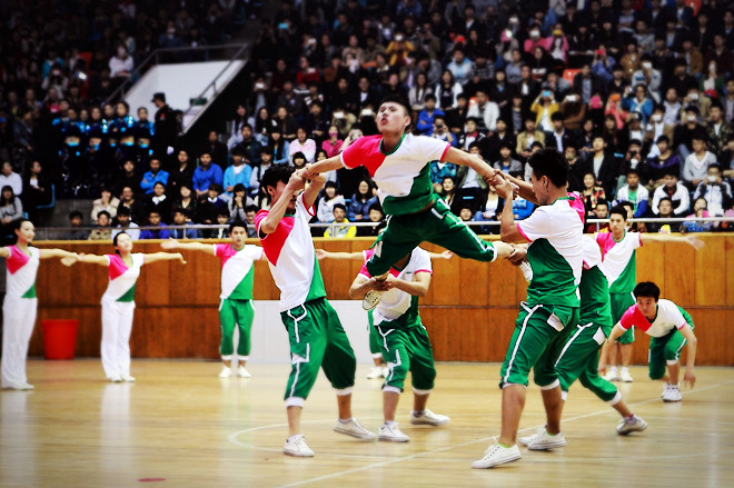 赛场上,进入决赛的27支参赛队伍准备充分、着装艳丽。比赛中有极具动感的花球啦啦舞、活力四射创意无限的自由啦啦舞、霸气十足的街舞啦啦舞、创意新颖的爵士舞啦啦舞等。我院的参赛队是由30名来自不同分院的学生组成,是所有参赛队中最富有青春活力、最有朝气的一支队伍。队员们平时利用课余时间在艺术学院青年教师刘洋的指导下,刻苦训练,积极备战,用刚强有力的动作完美地演绎了青春向上、激情澎湃的精神面貌,赢得了评委们的充分肯定,现场掌声雷动,最终以9.86分的高分将一等奖收入囊中。评分间隙,我院武术协会有指导老师仵誉峰带队,给观众提供了一场武术盛宴,赢得满堂喝彩。