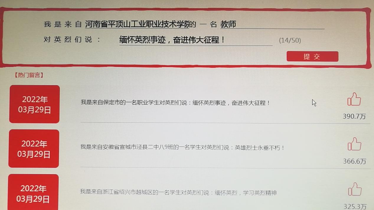 在庄严肃穆的时刻,老师们怀着崇高的敬意,深切缅怀每一位敢于担当、勇于献身的人民英雄。对于参加网上祭扫活动,老师们感触颇多,纷纷表示要学习人民英雄身上为民谋幸福、为国谋发展的高尚精神品质,并在学习和工作中将其发扬光大。中华民族历来英雄辈出、群英闪耀,缅怀先烈、敬仰英雄正是中华民族在悠久的历史发展中积淀而成的优秀品质。对英烈的缅怀,不仅是对英雄的告慰,更是我们磨砺初心、接力奋斗的精神洗礼。老师们表示,今后将进一步修身实践,用自己的知识和汗水报效国家、服务社会,为伟大的祖国早日建成富强、民主、文明、和谐、美丽的社会主义现代化强国不懈奋斗。