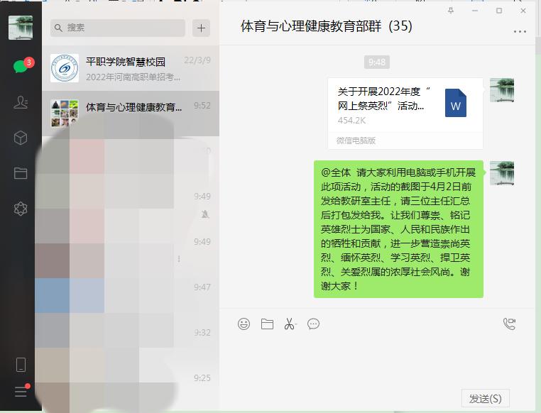 为深入贯彻落实习近平总书记关于烈士褒扬工作重要指示批示精神,传承弘扬英烈事迹和精神,引领崇尚、缅怀、学习、捍卫英烈的风尚,为党的二十大胜利召开营造良好社会氛围。4月1日至2日,体育与心理健康教育部党支部组织教职工结合当前疫情防控工作要求,在清明节期间开展以“奋进2022·网上祭英烈”为主题的网上祭扫纪念活动。