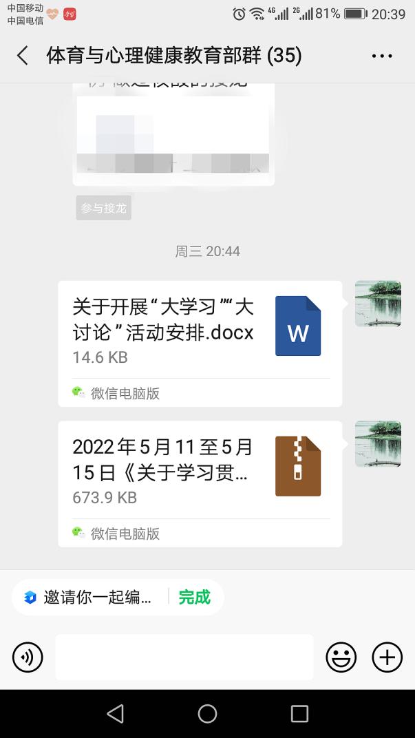 接到通知后,一是5月11日制定了体育与心理健康教育部党支部《关于开展“大学习”“大讨论”活动的安排》,鉴于目前疫情防控状况,把学校党委宣传部下发的通知及相关学习内容、讨论提纲及支部活动安排通过微信群发布,先行组织全体教职工开展线下自学。二是5月12日,支部组织召开了全体职工线上专题会议,对“大学习”“大讨论”活动进行了了再学习、再部署。会上,教职工还结合线下自学体会,进行了感悟交流和学习讨论。三是以组织领导到位、舆论引导到位、责任落实到位,坚决反对形式主义,抓紧抓实抓细,抓出成效,抓出影响为主基调,以教研室为单位,5月11日至15日,深入开展“大学习”“大讨论”活动,始终绷紧疫情防控这根弦,保持高度警惕、警觉,坚决克服麻痹思想,立足自身岗位,严而紧、快而实地抓好疫情防控各项工作。